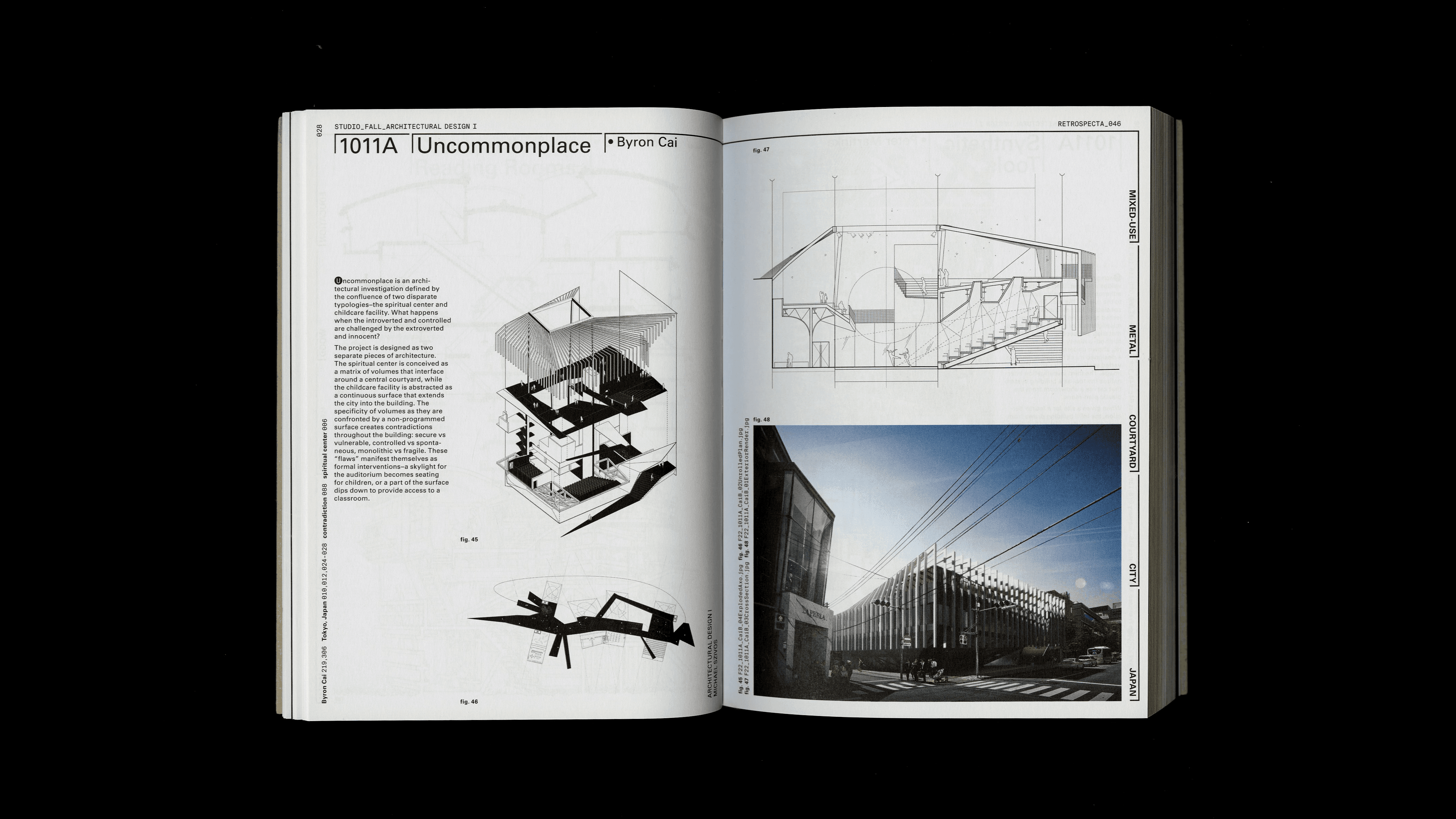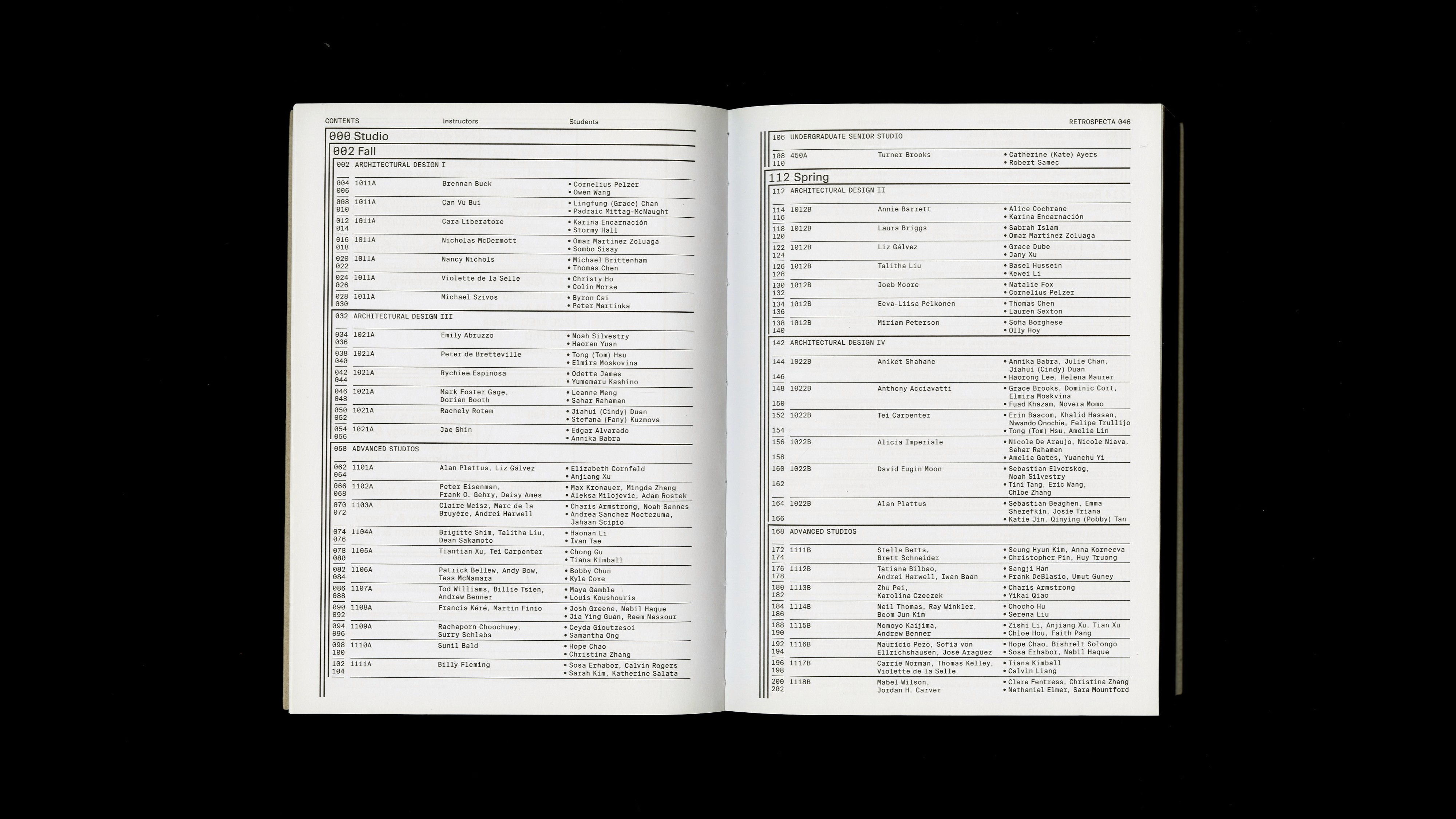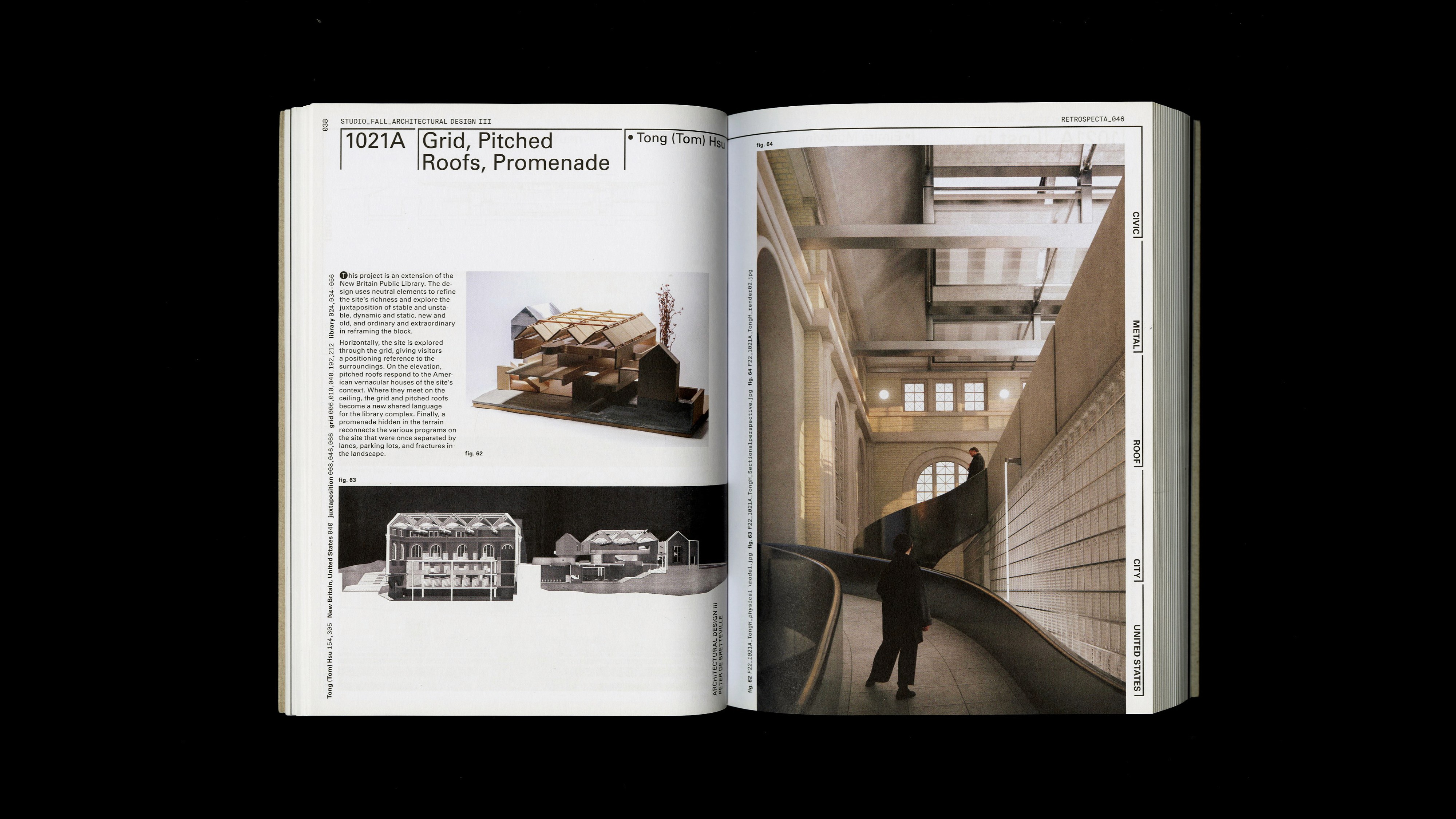 Retrospecta_046 is a reference book. Think of it as a catalog of architectural ideas. Each year, Retrospecta catalogs activity at the Yale School of Architecture, providing a snapshot of evolving architectural and graphic design trends. The book records events and outstanding circumstances that have uniquely impacted the academic, social, and political environment at the school. In producing this volume, the editorial team sought to archive the 2022-2023 academic year. A reference system based on a taxonomy of organizational concepts including tags and an indexing system allows the book’s content to be both searchable and cross-referential. The book closes with an archive of images associated with the past year, including colloquia, exhibitions, lectures, organizations, publications, student life, and symposia. Looking for something in particular? Check the index. Perhaps your style is more carefree? In that case, you might be better off flipping through the pages until a project tag captures your eye. Don’t be timid. Scribble in the margins, dogear your favorite projects; this book is happiest when it is used. Role: Book Design