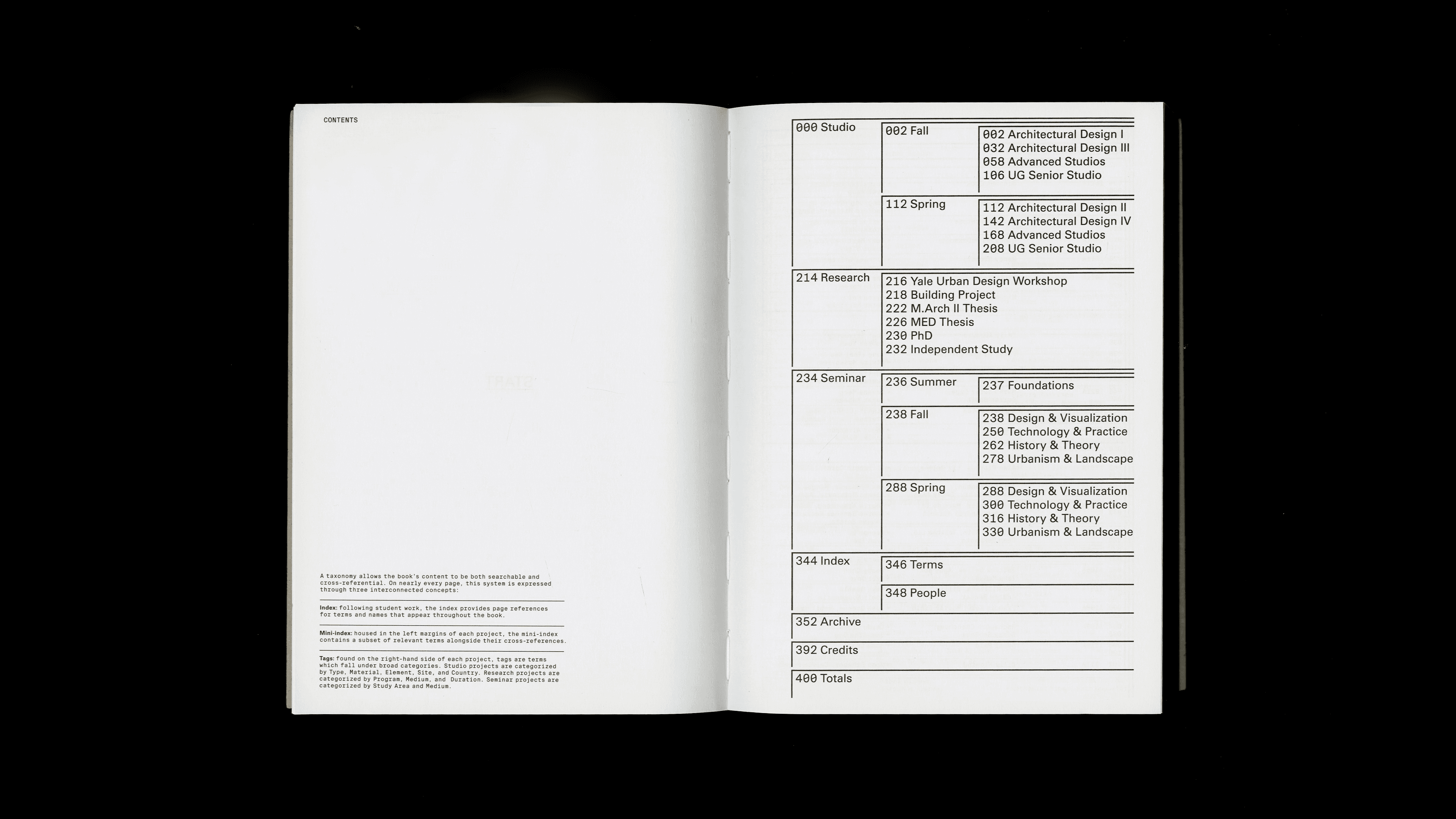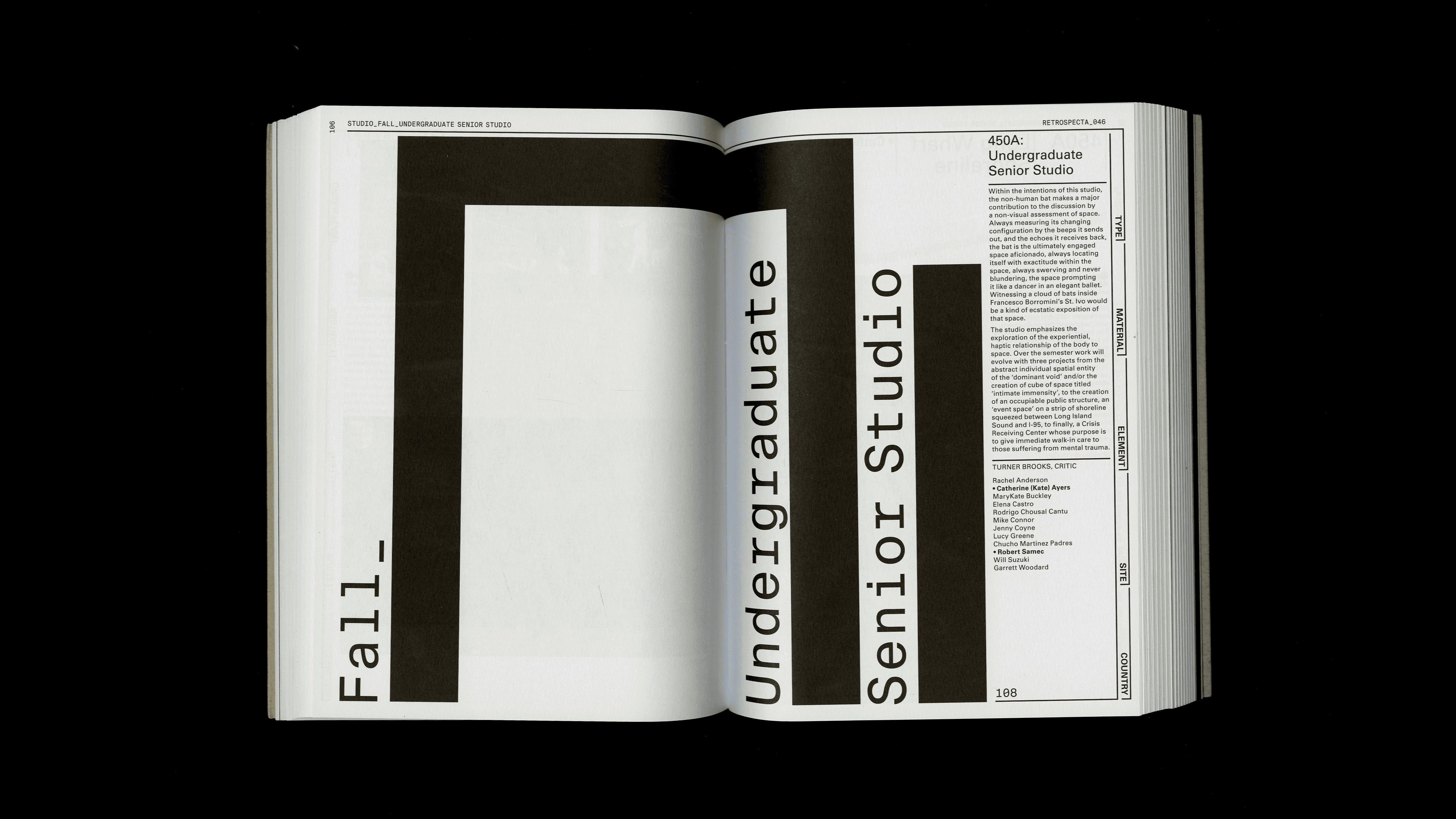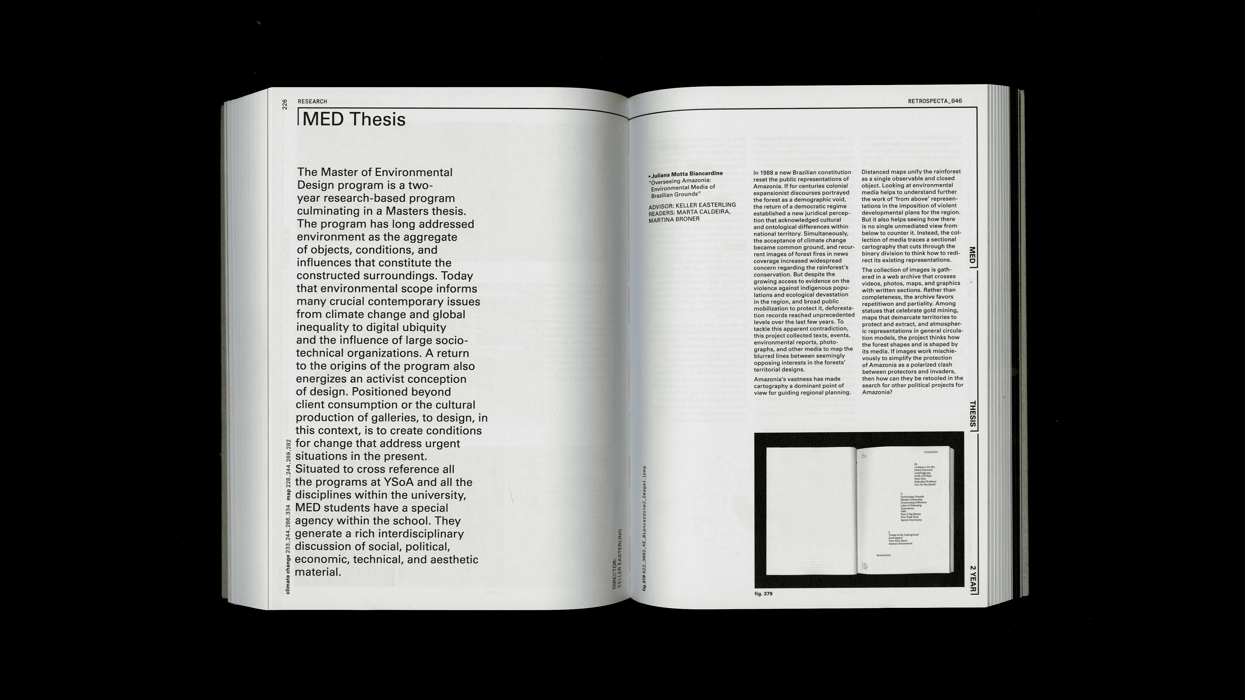 Retrospecta_046 is a reference book. Think of it as a catalog of architectural ideas. Each year, Retrospecta catalogs activity at the Yale School of Architecture, providing a snapshot of evolving architectural and graphic design trends. The book records events and outstanding circumstances that have uniquely impacted the academic, social, and political environment at the school. In producing this volume, the editorial team sought to archive the 2022-2023 academic year. A reference system based on a taxonomy of organizational concepts including tags and an indexing system allows the book’s content to be both searchable and cross-referential. The book closes with an archive of images associated with the past year, including colloquia, exhibitions, lectures, organizations, publications, student life, and symposia. Looking for something in particular? Check the index. Perhaps your style is more carefree? In that case, you might be better off flipping through the pages until a project tag captures your eye. Don’t be timid. Scribble in the margins, dogear your favorite projects; this book is happiest when it is used. Role: Book Design